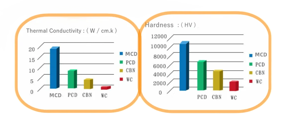- MCD has higher thermal conductivity than PCD. As a pure, uninterrupted diamond lattice, heat can travel through MCD very efficiently.